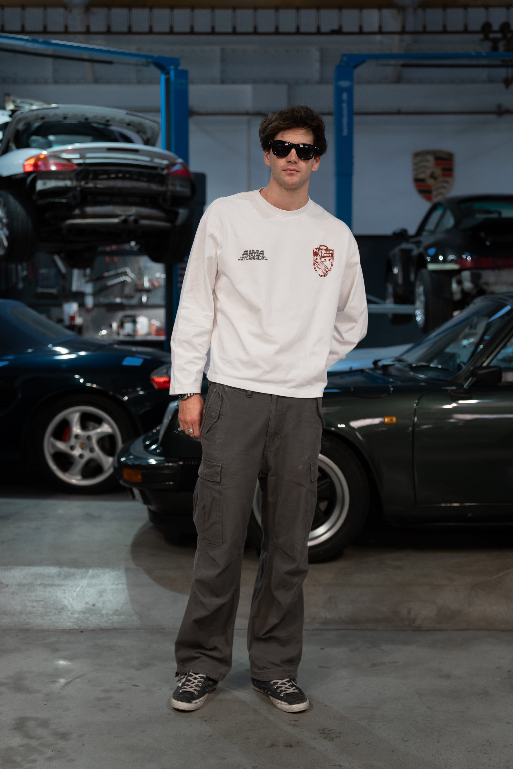 Camiseta de manga larga en color blanco, con corte relajado y silueta boxy, ajustada en las mangas y corta de cintura para estilizar la figura. Confeccionada en algodón de 300 GSM, lo que permite usarla también como jersey ligero. Incluye bordado “Maison Aima” en la manga izquierda como detalle distintivo.